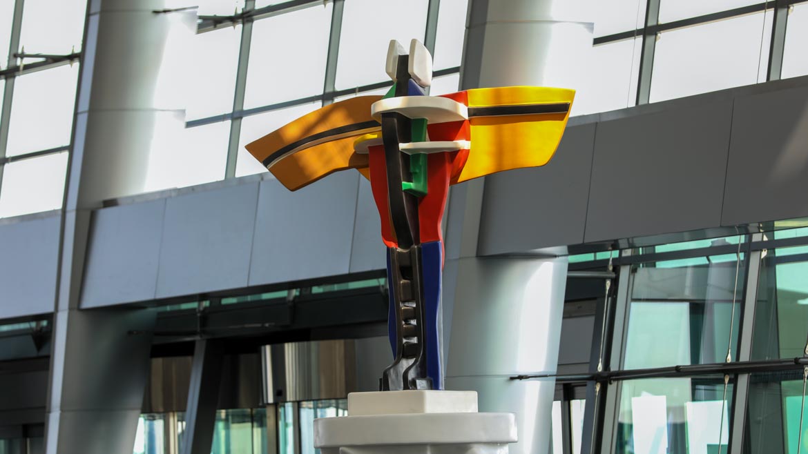 Locate on map Flying Man By Dia Al-Azzawi In the first sculpture the artist Dia Azzawi has taken the story of Bin Firnas, a historical figure from the Islamic world who was an early pioneer in experimenting with flight, as the basis for a monument to modern air travel. Keeping with the artist's practice of reactivating historical forms as contemporary means of expression, the sculpture has a cylindrical form inspired by the obelisks that appeared in Mesopotamia in third century B.C. The second sculpture is inspired by historical figure Armen Firman. One day in 852 AD, before a crowd of spectators, Armen Firman climbed to the top of the minaret of the Great Mosque in Cordoba, for an experiment. He wanted to test a new machine that he had built based upon an elementary comprehension of the mechanics of flight gained from observations of nature. It consisted of a silk cloak reinforced with wooden rods in order to form wings. When Firman jumped from the minaret, he did not fly, yet neither did he fall. Rather, the silk wings filled with air, which slowed his descent to the ground.