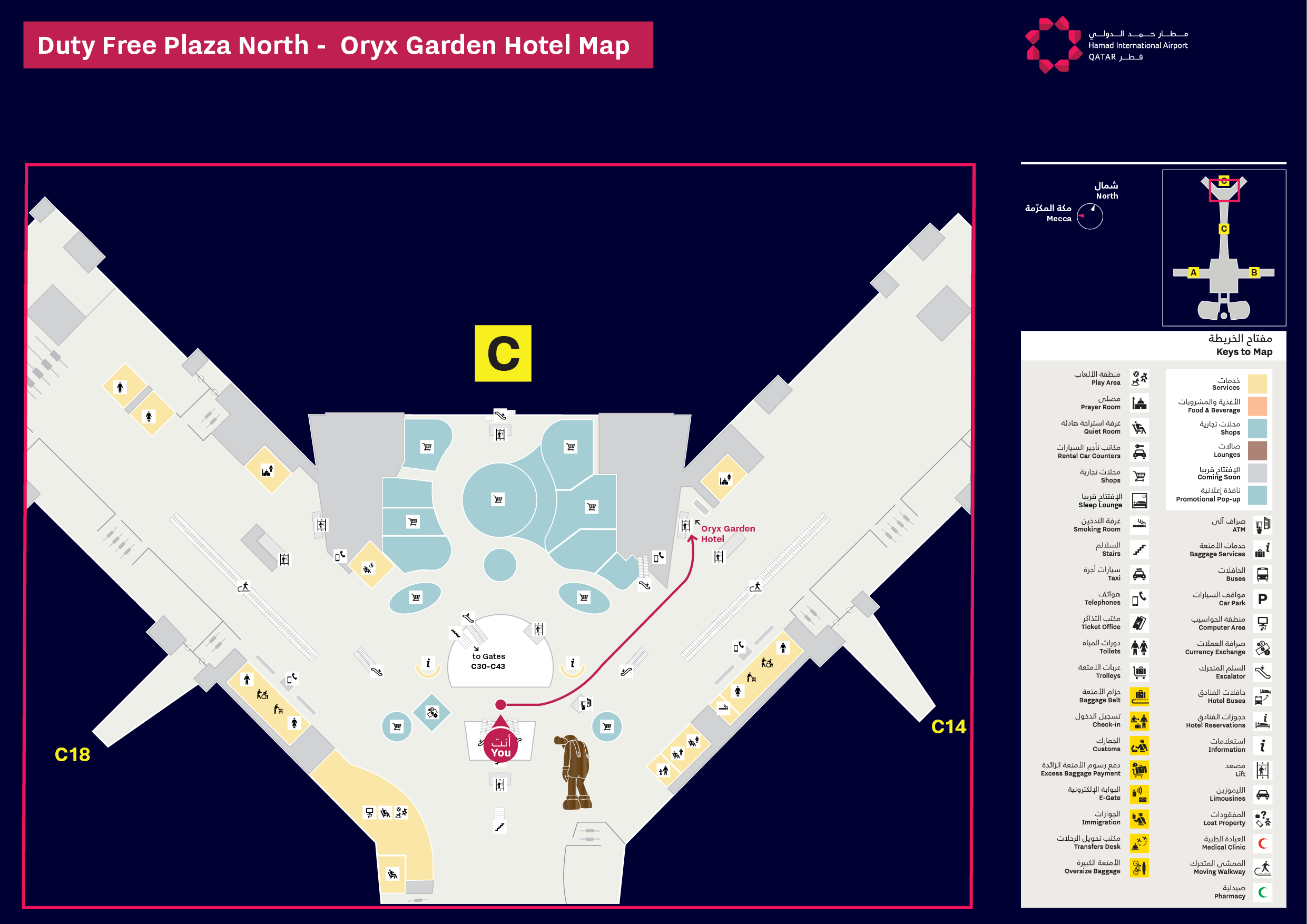 Locate on map Oryx Garden Hotel CONCOURSE C Located at the North Node passenger terminal, at the end of Concourse C, the Oryx Garden Hotel offers all travellers the utmost comfort in all 100 guest rooms. It is the perfect place for passengers to recharge between flights, thanks to the nearby food court and the Oryx Hotel’s Vitality Wellbeing & Fitness Centre, accessible at a special guest rate.